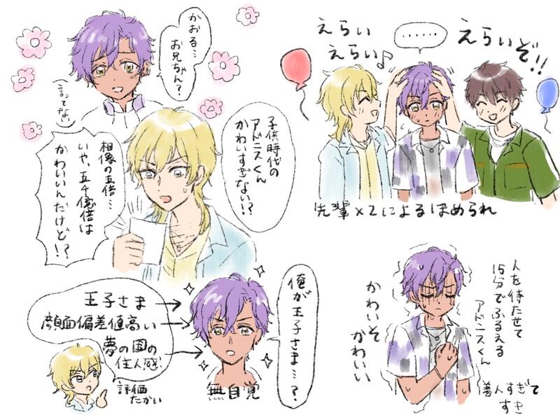 英+アドの組み合わせは、純粋に仲良くなれたら嬉しいアドニスくんと、いろいろ思惑があるような気がしてしまう英智くんの織りなすハーモニーがたまらないなと思っています。周り(零さんとか弓弦とか)が微妙にハラハラしてるのも最高。